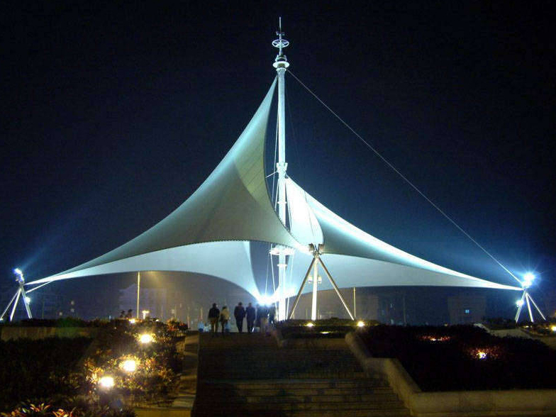 景觀膜結構又(yòu)稱張拉膜景觀,主要(yào)通(tōng)過膜結構的(de)張拉式 呈現(xiàn)出唯美(měi)的(de)結構特征;膜材料是(shì)指聚酯纖維基布或PVDF、PVF、PTFE等不(bù)同的(de)表面塗層,配以優質的(de)PVC組成的(de)具有(yǒu)穩定的(de)形态,并可(kě)承受一(yī)定載荷的(de)建築紡織品。它的(de)壽命因不(bù)同的(de)表面塗層而異,一(yī)般可(kě)達成10-20年(nián);其外(wài)觀整潔大(dà)方,自(zì)潔性強。主要(yào)應用(yòng)于各大(dà)公園,世博園,和(hé)一(yī)些(xiē)廣場(chǎng),商場(chǎng)等場(chǎng)所。